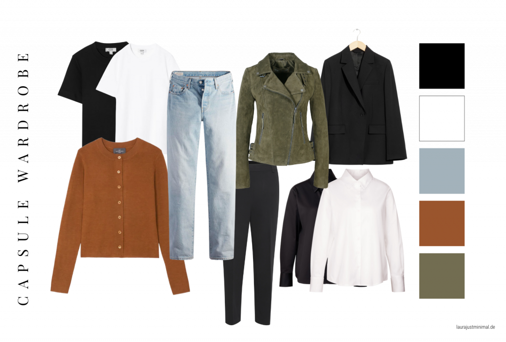 Eine Capsule Wardrobe funktioniert am besten mit Farben, die sich gut kombinieren lassen. Viele wählen neutrale Farben, wie Weiß, Schwarz, Beige, Grau und Blau. Aber meiner Meinung nach, musst du dich darauf nicht versteifen. Es gibt tolle Farben, wie beispielsweise Aprikot, Gelb oder ein Froschgrün, die einem super stehen und ebenfalls kombinierbar sind.
