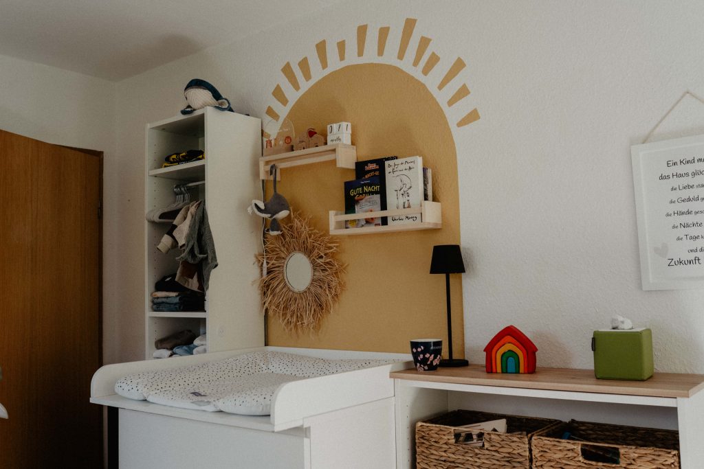 Ein bisschen Persönlichkeit darf natürlich auch nicht fehlen: Über dem Wickeltisch hängt ein kleiner Spiegel, den ich selbst gestaltet habe – mein kleines DIY-Projekt. Außerdem habe ich zwei Regale so angebracht, dass sie praktisch sind, aber beim Wickeln nicht im Weg stehen.