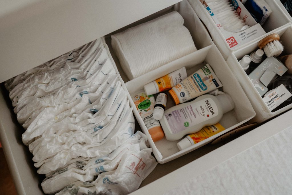 3. Praktische Aufbewahrung: Körbe, Boxen oder ein Rollwagen helfen dabei, Windeln, Pflegeprodukte und Wechselkleidung ordentlich zu verstauen, ohne dass etwas herumliegt.