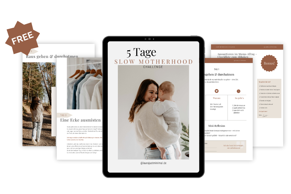 Hast du Lust dieses Thema anzugehen? In meiner 5-tägigen Slow Motherhood Challenge kannst du die ersten Schritte wagen. Damit es für dich so leicht wie möglich ist, habe ich dir alle Infos und Ideen zum Beginnen in einer kostenlosen PDF zusammengefasst. Lade sie dir gerne direkt herunter und viel Spaß dabei!